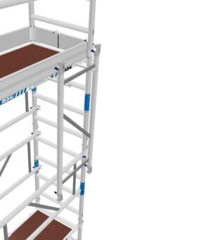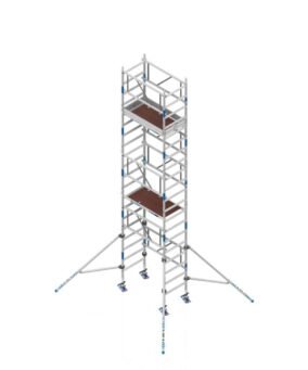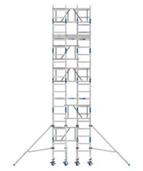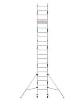De steiger wordt geleverd als een compleet pakket en is eenvoudig op te zetten. De frames klikken moeiteloos in elkaar, de platformen met luik zorgen voor een veilige doorgang en de telestabilisatoren bieden extra stevigheid. Dankzij de verstelbare wielen kan de steiger eenvoudig op ongelijke ondergronden worden geplaatst en waterpas worden gezet.